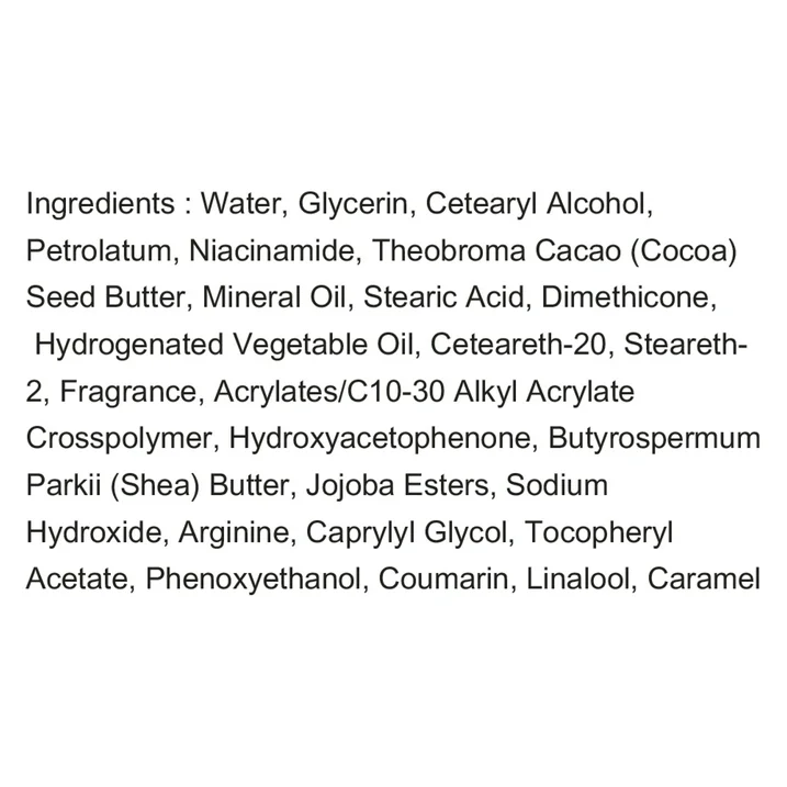 Parfum Gourmand : Laisse sur la peau une senteur délicate et réconfortante de cacao et de karité, vous enveloppant d’un voile de bien-être qui dure toute la journée.