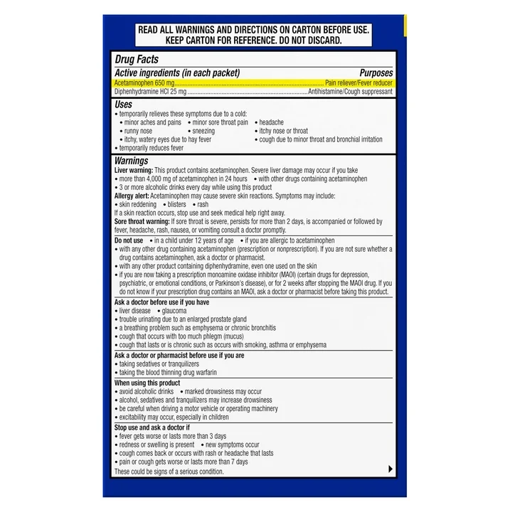 Ne laissez pas le rhume ou la grippe vous ralentir ! Obtenez un soulagement puissant et sans somnolence avec la Poudre Médicament Theraflu Jour (6 Compte, Saveur Miel Citron), disponible chez Blue Bazar, votre référence pour les produits de pharmacie américains à Dakar !